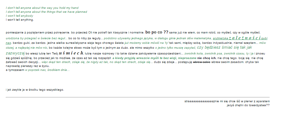 Chwilę po rozpoczęciu pisania bloga pojawił się photoblog, który otwierał przede mną zupełnie nowe możliwości. Oczywiście na początku liczyły się tylko zdjęcia i miliony emotek w opisie. Później zdjęcia zaczęły schodzić na dalszy plan, a liczyła się możliwość zabawy formą. Różne kroje pisma i kolory. Różne wielkości fontów. Tworzenie historii i zagadek, do których zdjęcia były tylko dodatkiem.
